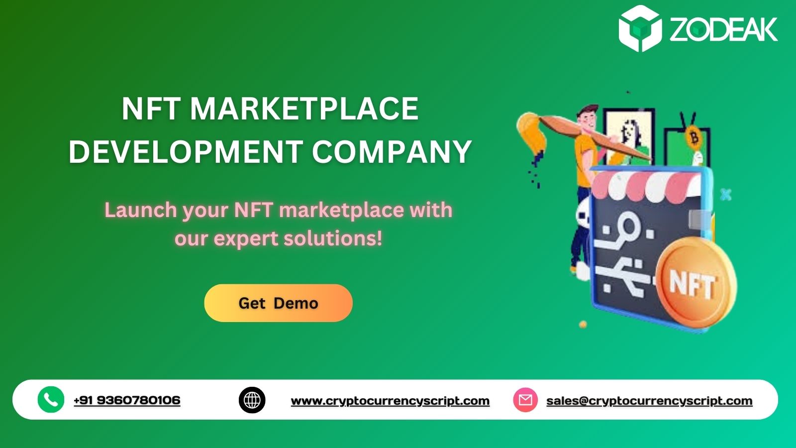 NFT marketplace development entails providing a platform for the purchase, sale, and trading of non-fungible tokens (NFTs), allowing users to interact with digital assets. This method combines blockchain technology, secure payment mechanisms, and user-friendly interfaces to improve the entire trading experience. Elevate your digital presence with our NFT marketplace development services from Zodeak Technology, designed to empower creators and collectors alike! We build secure, customizable platforms that streamline the buying and selling of NFTs, helping you tap into the booming digital asset market.